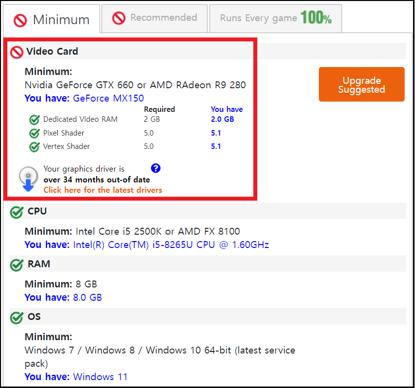 저는 테스트를 노트북으로 진행하였는데, 결과는 최소사양(Minimum)과 권장사양(Recommended)에서 모두 부적합 판정을 받았습니다. 그리고 무엇이 부적합한지 각 세부 항목별로 다음과 같이 알려줍니다. 저 같은 경우 비디오 카드(그래픽 카드)에서 그래픽 드라이버 버전이 오래되어 부적합 판정을 받았습니다. 세부항목 중 하나라도 부적합하면 전체 판정에서 부적합 판정을 받습니다.
