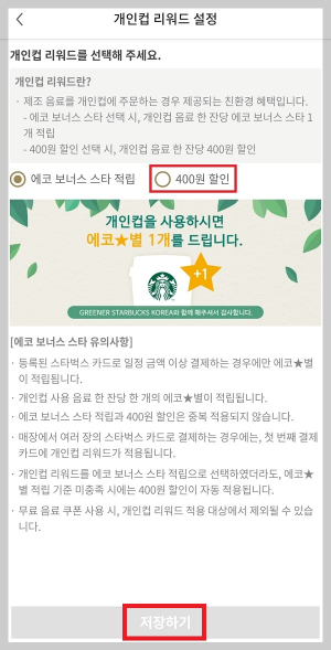 STEP 3. 개인컵 리워드 설정 화면에서, 에코 보너스 스타 적립(기존)에서 "400원 할인"으로 변경 후 "저장하기"를 터치하면 설정변경이 완료됩니다.