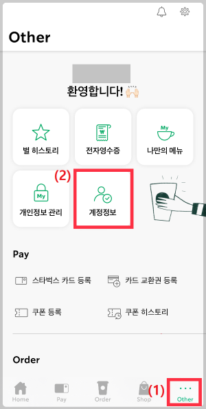 STEP 1. 스타벅스 앱 실행 후 화면 하단의 "Other"를 터치하고, 이어서 "계정정보"를 터치합니다.