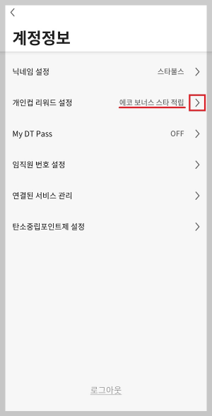 STEP 2. 계정정보 화면의 개인컵 리워드 설정에서, ">"를 터치합니다.(화면에서 현재 설정된 보상은 에코 보너스 적립입니다.)