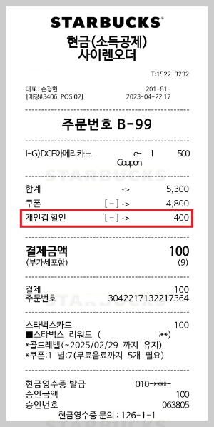 개인컵 리워드 400원 할인 적용 후, 텀블러를 지참하여 커피를 주문하면 아래 영수증에서 400원 할인이 적용된 것을 확인하실 수 있습니다.