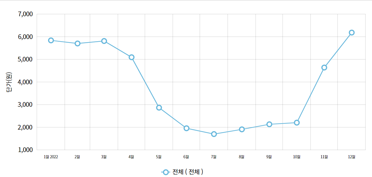 - 2022년 도매가격 기준으로 6월이 최저가격이었습니다. 월별 가격은 참고만 하고, 구매할 때는 가격뿐만 아니라 참외의 제철 시점을 고려하여 구매하는 것이 좋습니다.