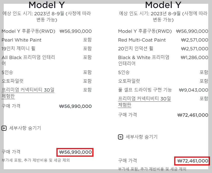 테슬라 코리아 홈페이지에 공시된 테슬라 모델Y RWD의 가격은 5,699만원입니다. 이는 옵션 추가 금액을 제외한 순수한 차량 가격입니다. 각 옵션 항목별 추가금액은 다음과 같습니다. 차량색상(최대 2,571,000원), 휠 선택(2,571,000원), 내부 인테리어(1,286,000원), 향상된 오토파일럿(4,522,000원), FSD(9,043,000원)입니다. 풀옵션을 선택할 시(오토파일럿 제외하고 FSD 채택) 전체금액은 72,461,000원으로 기본차량 대비 대략 1,500만의 차이가 있습니다.